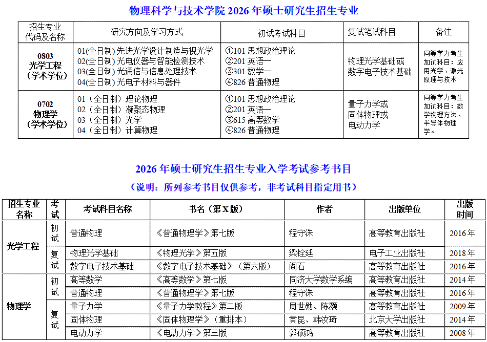 现有学术学位一级学科硕士点2 个:光学工程、物理学。