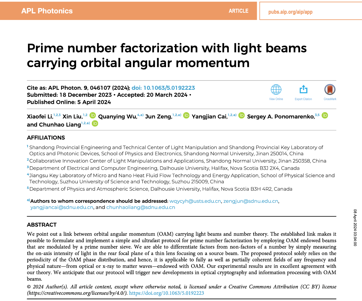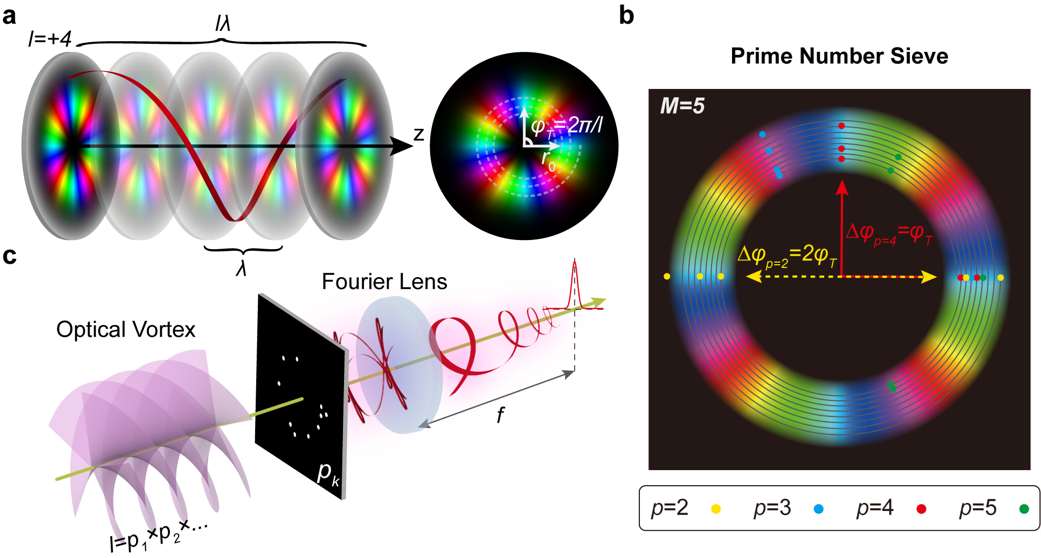 、光场调控及应用中心蔡阳健教授团队一起取得一项研究成果。该研究首次建立了轨道角动量光束与数论之间的独特联系,并利用质数筛选器调制的轨道角动量光束,成功制定并实现了一种新颖且高效的质数因子分解协议。这一开创性的成果以“Prime number factorization with light beams carrying orbital angular momentum”为题,发表在物理学一区期刊《APL Photonics》上。论文提出并实现了一种概念简单、高效的经典光学方法来进行质数分解,该方法基于携带轨道角动量的涡旋光束在自由空间中传播相位分布的固有周期性,待分解的因数对应于光束的拓扑电荷,并且所有试验因子都被封装到筛选器中,实验上利用数字微镜装置快速刷新筛选器以改变试验因子理论上可以在3.55秒内分解出高达10^6数量级的所有质数。