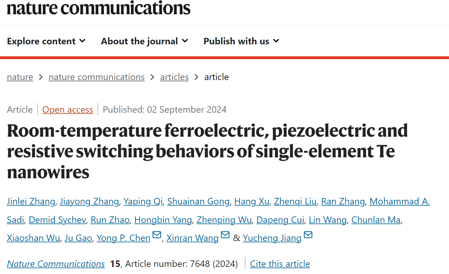 论文一:“Room-temperature ferroelectric, piezoelectric and resistive switching behaviors of single-element Te nanowires”,该成果首次报道了单元素Te纳米线的室温垂直向铁电性,并利用其优异的面内输运性质,成功构建了自极化铁电场效应晶体管。该研究成果打开了单元素铁电性的大门,并为超高密度数据存储和内存计算设备提供了全新的电子元器件。张金磊为第一作者,姜昱丞为通讯作者,我校为第一完成单位。