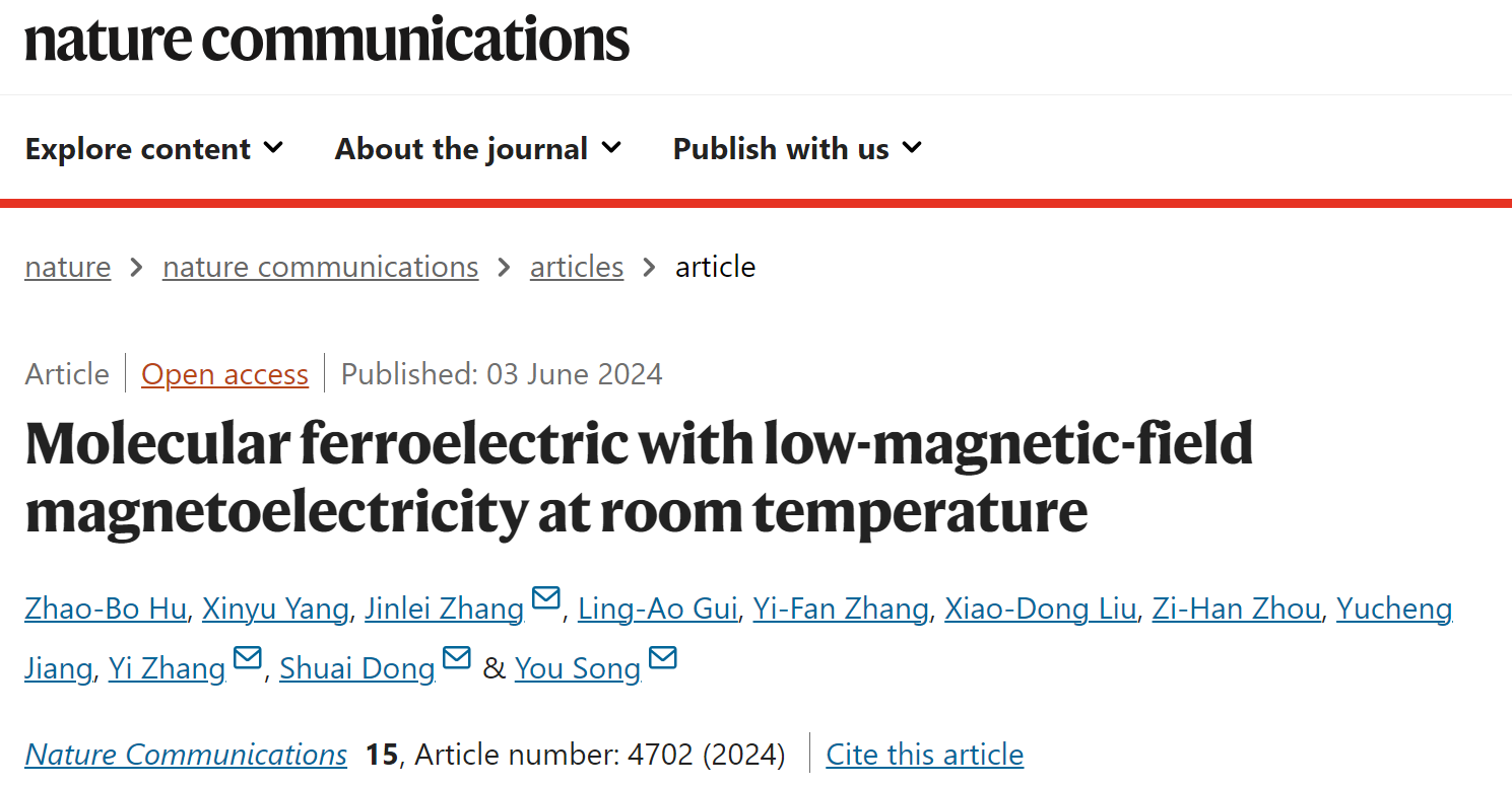 论文二:“Molecular ferroelectric with low-magnetic field magnetoelectricity at room temperature”,该工作创新性的将磁致伸缩性质引入铁电材料中,绕开多铁材料中磁性居里温度低的问题,从而实现室温磁电耦合效应。这一方法不仅为多铁材料扩展了更多的种类,而且为实用性多铁器件奠定了坚实的物质基础。张金磊为共同一作兼通讯作者,我校为通讯单位。