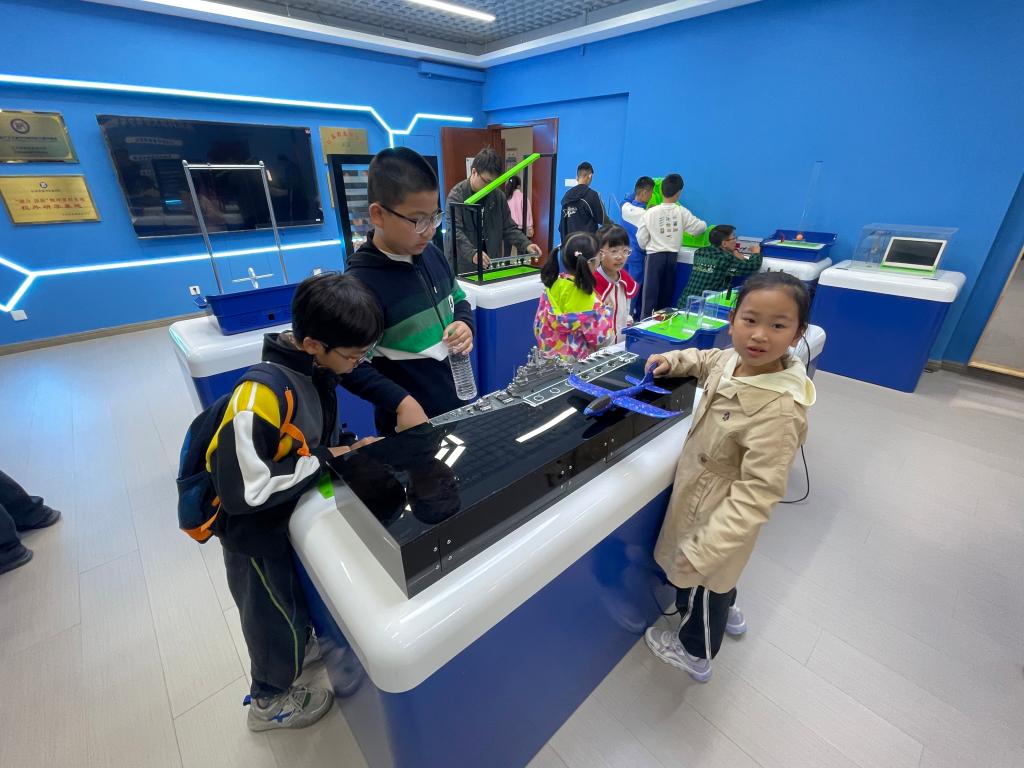 物理探索科普馆经过升级拥有100余套科普演示仪,场馆极具舒适感和科技感。学生一边观察和体验,一边询问其中的原理,老师和志愿者不断示范和讲解涉及的物理原理,将那些“音乐声控喷泉”“温差发电”“消失的电”等物理现象生动地展示在孩子们面前。“会爬坡”的锥体、全时预警激光炮防御演示、你我换脸等有趣的实验,让学生们“玩”得十分投入。