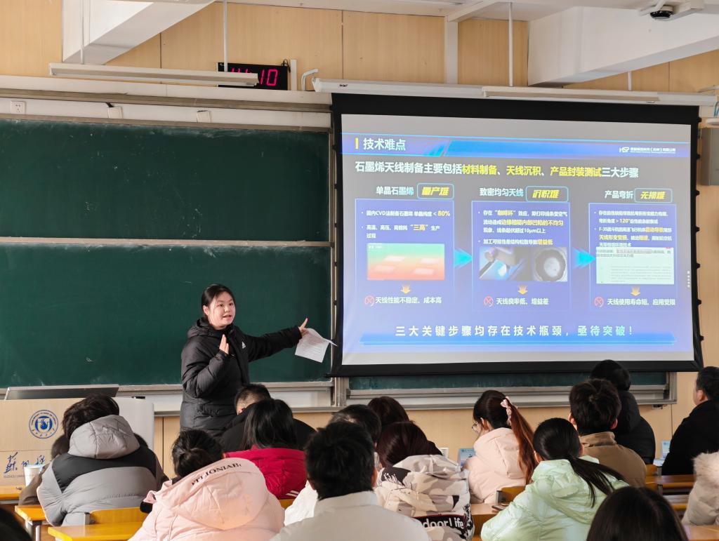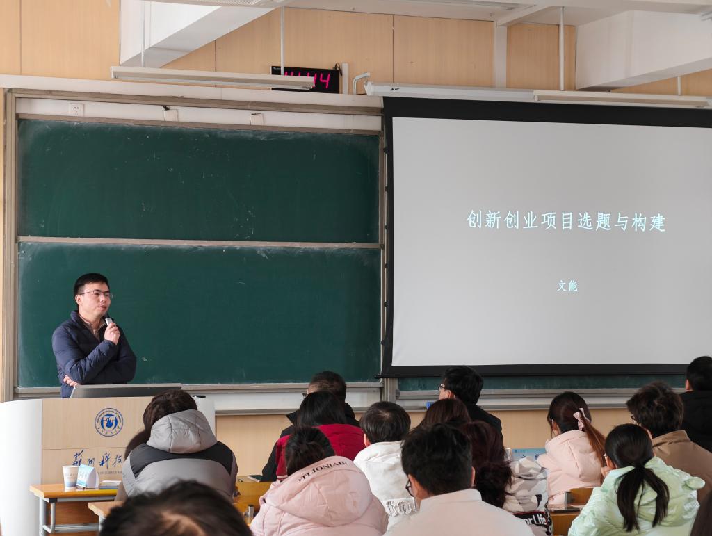 随后,中国国际大学生创新大赛及“挑战杯”国赛评委、能创天使基金创始合伙人、国家生化工程技术研究中心特聘研究员文能老师,作题为“创新创业项目选题与构建”的专题讲座。文老师从评审专家和投资人的双重视角,系统阐述了项目选育逻辑、核心竞争力构建方法与成果转化路径,并结合宇树科技等典型案例,深入剖析了优秀项目的成长脉络与备赛关键,讲座内容高屋建瓴、指导性强,为师生提供了前瞻而落地的备赛指引。