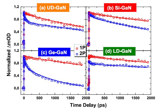 该工作从实验和理论上揭示了在不同的注入方式下,缺陷浓度和位错密度对n型GaN载流子寿命的影响机理。根据模型,可以得出在单光子高注入下,载流子的复合速率受限于较慢的深能级缺陷对电子的俘获效应;而在双光子低注入下,由于快速的空穴俘获效应导致初始载流子寿命显著缩短,此外载流子寿命和瞬态光谱响应还可以通过固有载流子浓度或位错密度进一步调控。这让我们可以选择合适的激发和样品掺杂条件来控制GaN中的载流子寿命和探测光的瞬态吸收光谱,使其应用于发光二极管,太阳能电池和全光开关等不同的光子器件中。