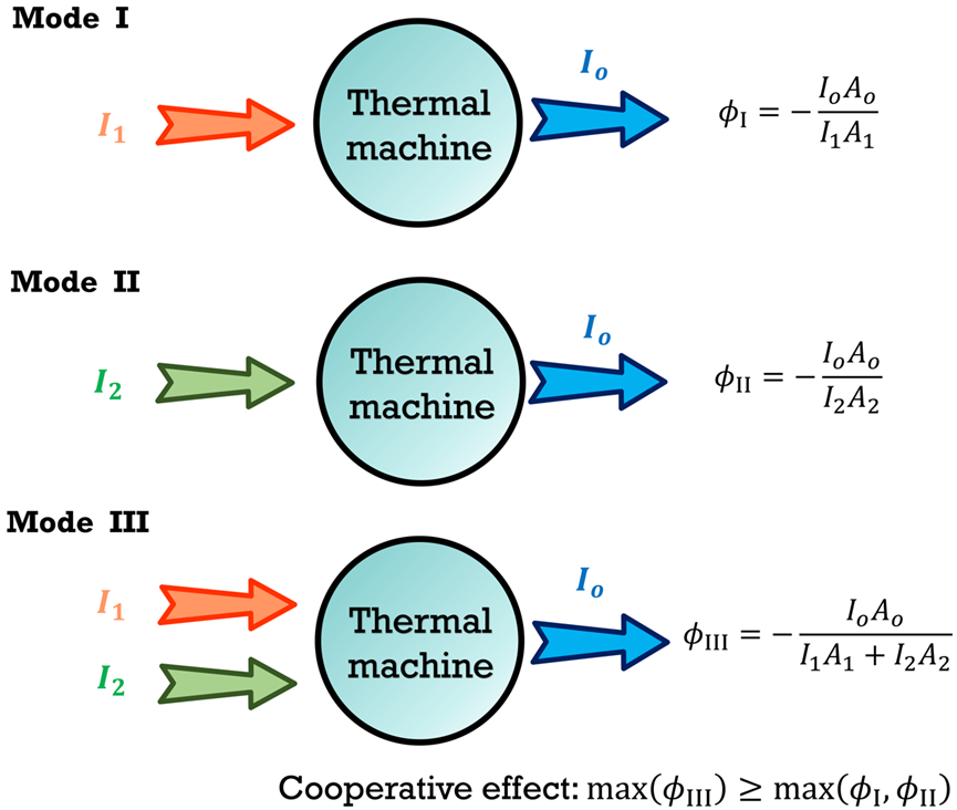 图1. 三端口热电装置中,多个输入的能量装置的合作效应的能量转换效率要比具有单个输入的装置的能量转换效率要高。