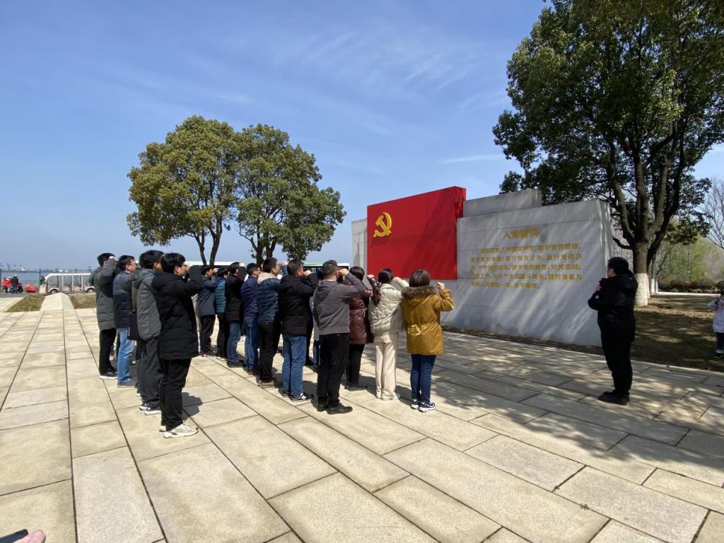 在渡江胜利公园,党员同志们来到纪念碑广场,瞻仰了渡江战役纪念碑,列队面向国旗齐唱国歌,面向党旗重温入党誓词,并向纪念碑敬献花篮,随后党员同志们走进“信仰之脊”——双山岛渡江战役展示馆,通过讲解员声情并茂的讲解,重温当年百万雄师过大江的战争史诗,追随激荡人心的红色印记,缅怀革命先辈的光辉足迹。习近平总书记曾指出:淮海战役胜利是靠老百姓用小车推出来的,渡江战役胜利是靠老百姓用小船划出来的。历史充分证明,江山就是人民,人民就是江山。党员同志们通过纪念碑、透过一幅幅老照片和旧事物,一起重温渡江故事,深刻感悟了革命先辈的奋斗历程,感受到信仰的力量。