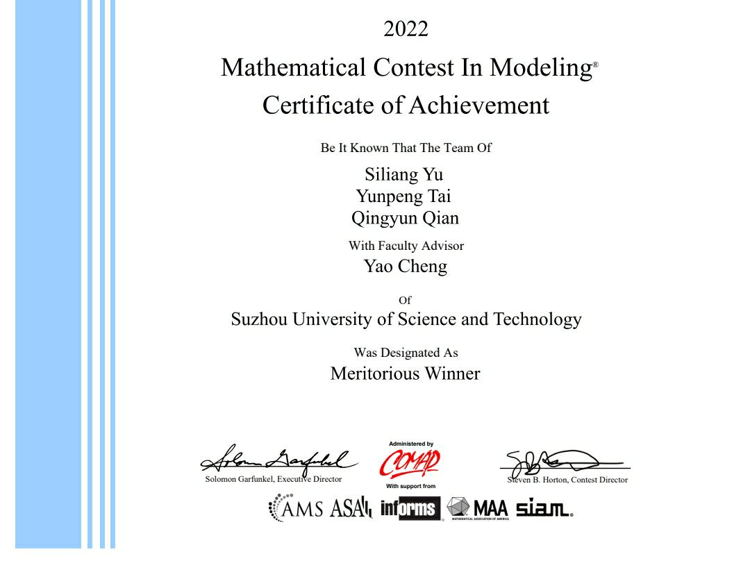 应用物理学专业本科生钱青云同学所在团队荣获MeritoriousWinner奖(一等奖)。
